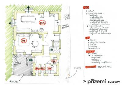 The house has a very simple layout, both floors include a hall. The one on the ground floor is used more as a place to drop off things "on the go", the one upstairs is a popular playing room, reading room or additional sleeping space.